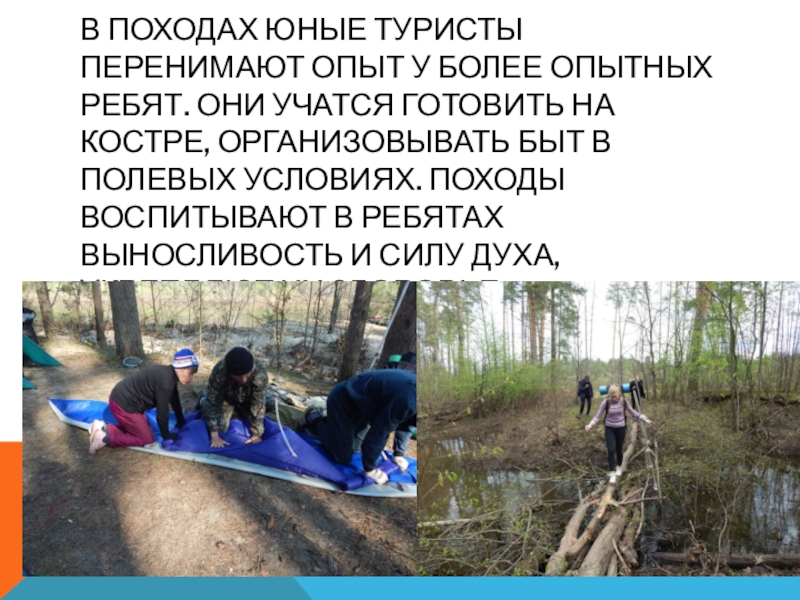 Слайд 6В походах юные туристы перенимают опыт у более опытных ребят. Они