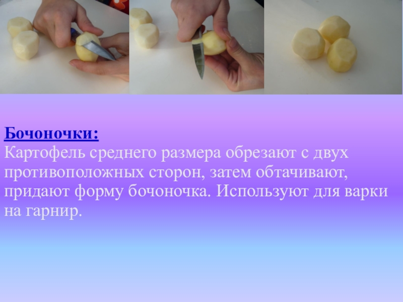Картофель среднего размера обрезают с двух противоположных сторон, затем обтачивают, придают