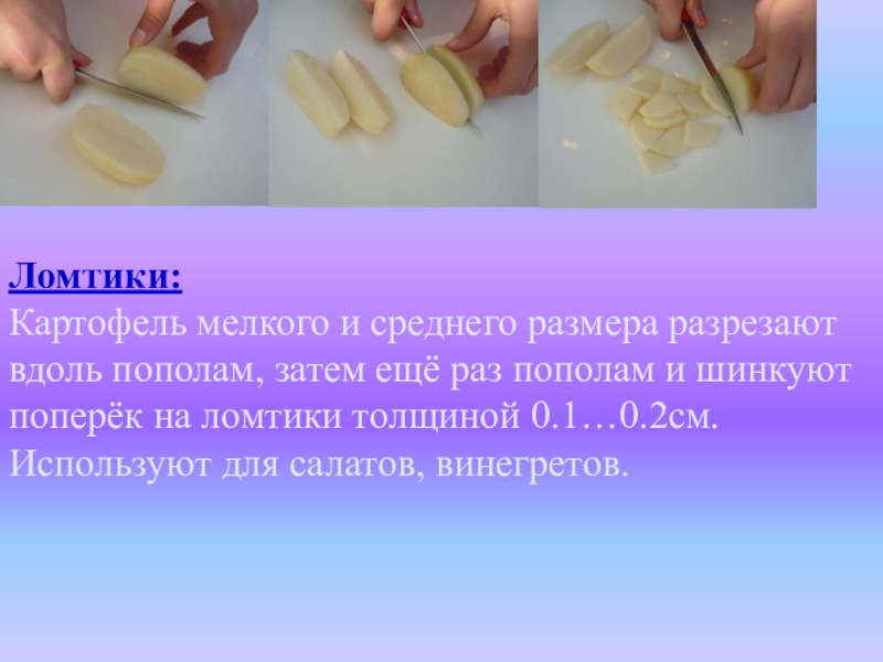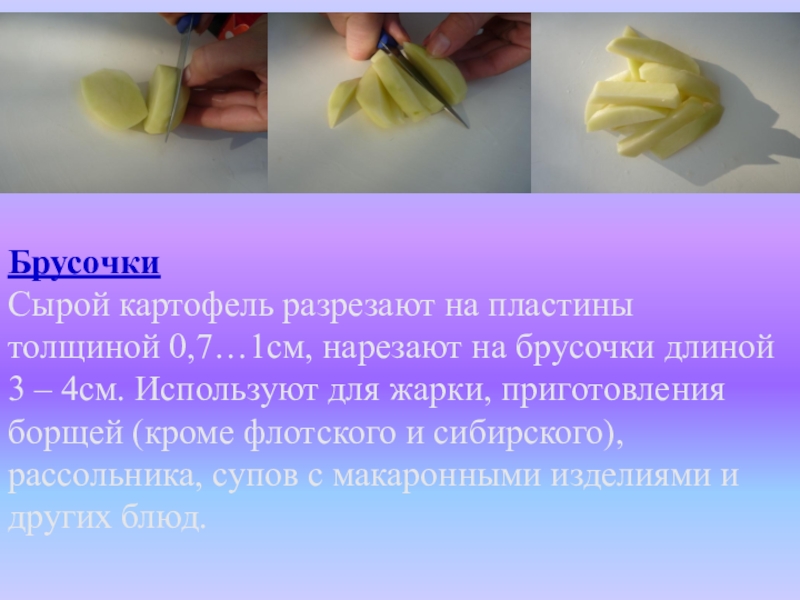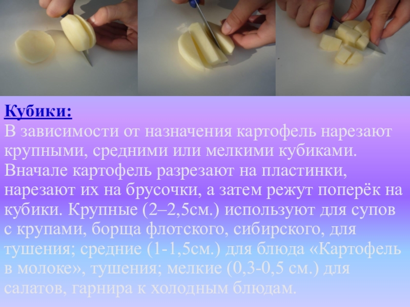 кубиками. Вначале картофель разрезают на пластинки, нарезают их на брусочки, а затем режут поперёк на кубики. Крупные (2–2,5см.) используют для супов с крупами, борща флотского, сибирского, для тушения; средние (1-1,5см.) для блюда «Картофель в молоке», тушения; мелкие (0,3-0,5 см.) для салатов, гарнира к холодным блюдам.