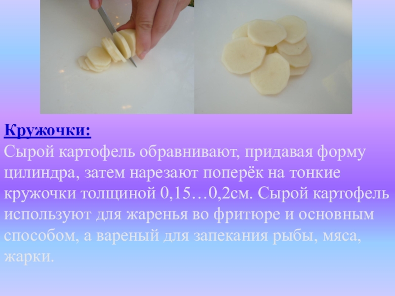 кружочки толщиной 0,15…0,2см. Сырой картофель используют для жаренья во фритюре и основным способом, а вареный для запекания рыбы, мяса, жарки.