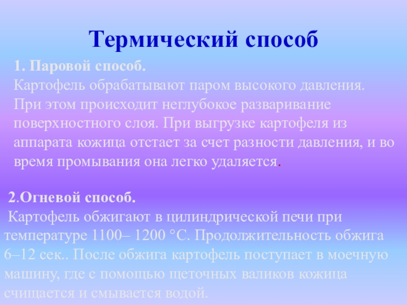 Картофель обжигают в цилиндрической печи при температуре 1100– 1200 °С. Продолжительность обжига 6–12 сек.. После обжига картофель поступает в моечную машину, где с помощью щеточных валиков кожица счищается и смывается водой.