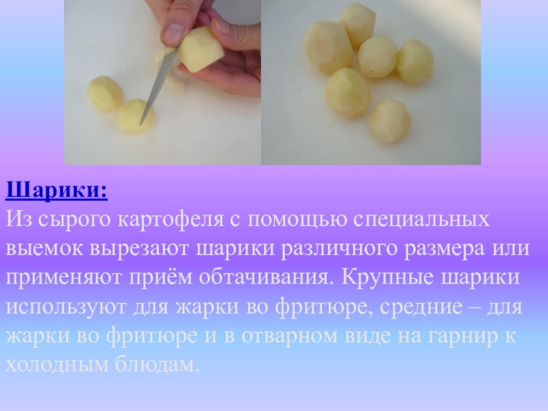 или применяют приём обтачивания. Крупные шарики используют для жарки во фритюре, средние – для жарки во фритюре и в отварном виде на гарнир к холодным блюдам.