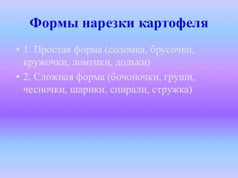 1. Простая форма (соломка, брусочки, кружочки, ломтики, дольки)