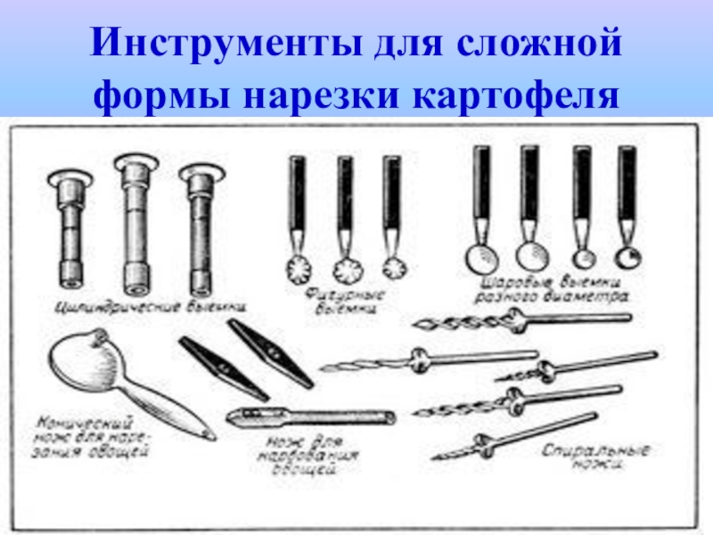 Слайд 6Инструменты для сложной формы нарезки картофеля