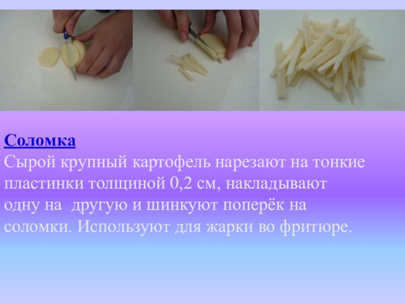 одну на другую и шинкуют поперёк на соломки. Используют для жарки во фритюре.