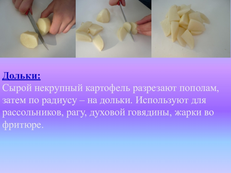 В зависимости от назначения картофель нарезают крупными, средними или мелкими