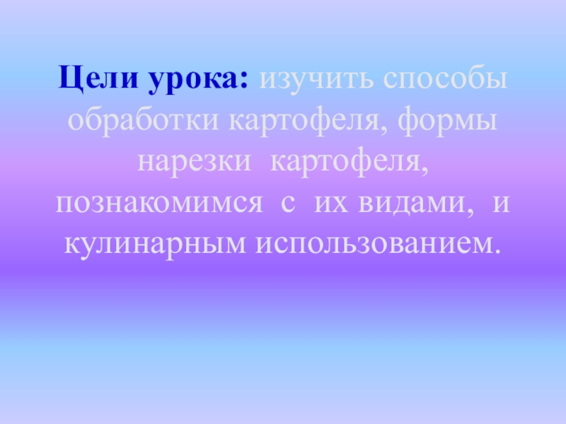 Слайд 2Цели урока: изучить способы обработки картофеля, формы нарезки картофеля, познакомимся с