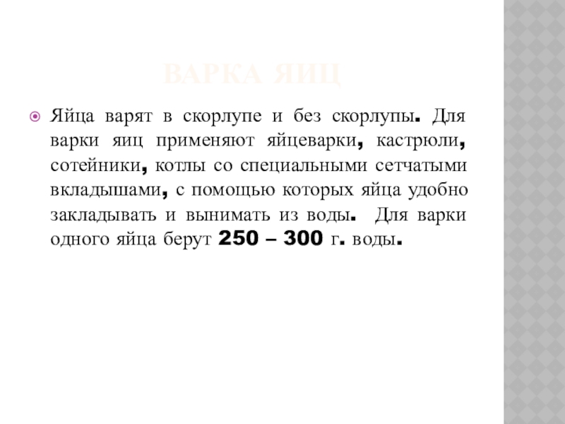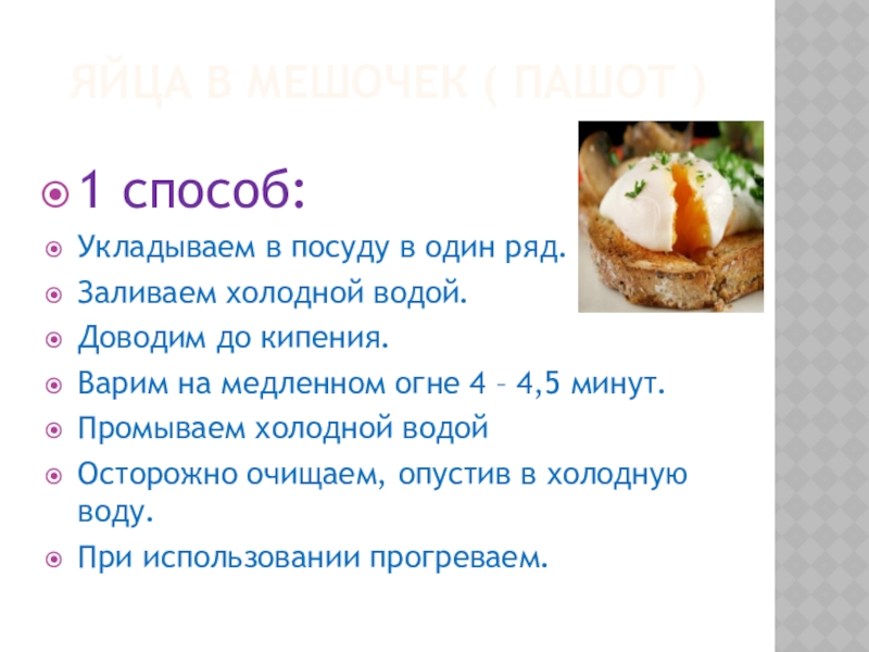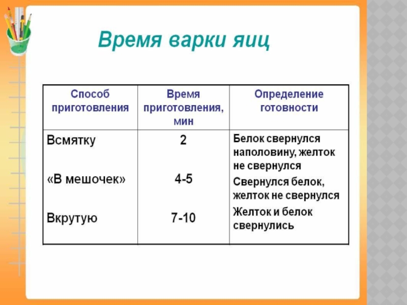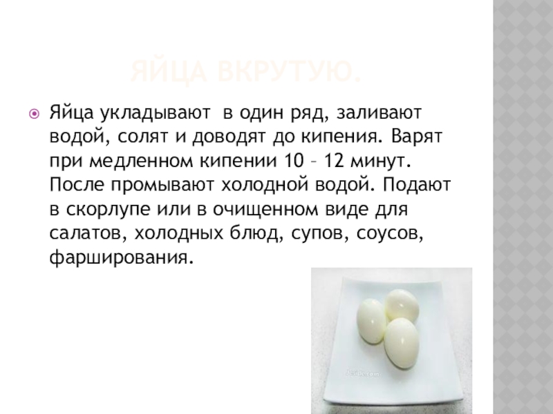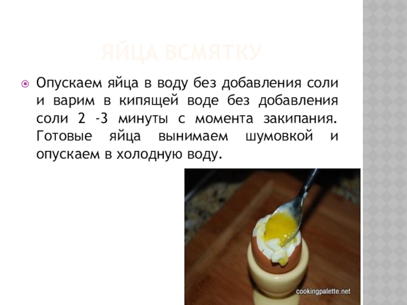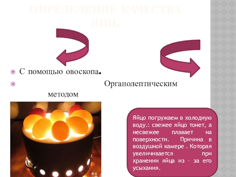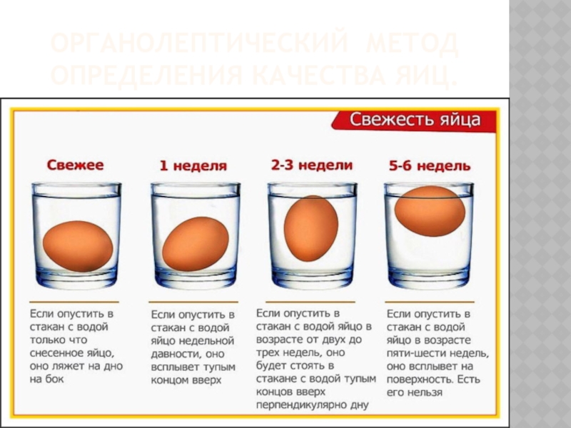 Яйцо погружаем в холодную воду.: свежее яйцо тонет, а несвежее плавает на поверхности. Причина в воздушной камере . Которая увеличивается при хранении яйца из – за его усыхания.