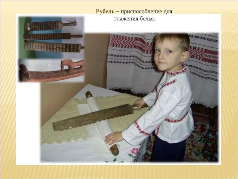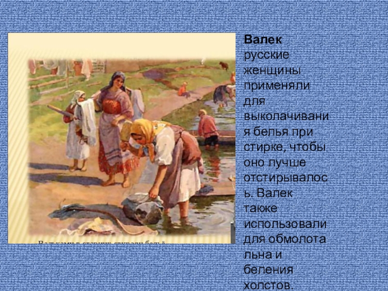 Слайд 17Валек русские женщины применяли для выколачивания белья при стирке, чтобы оно