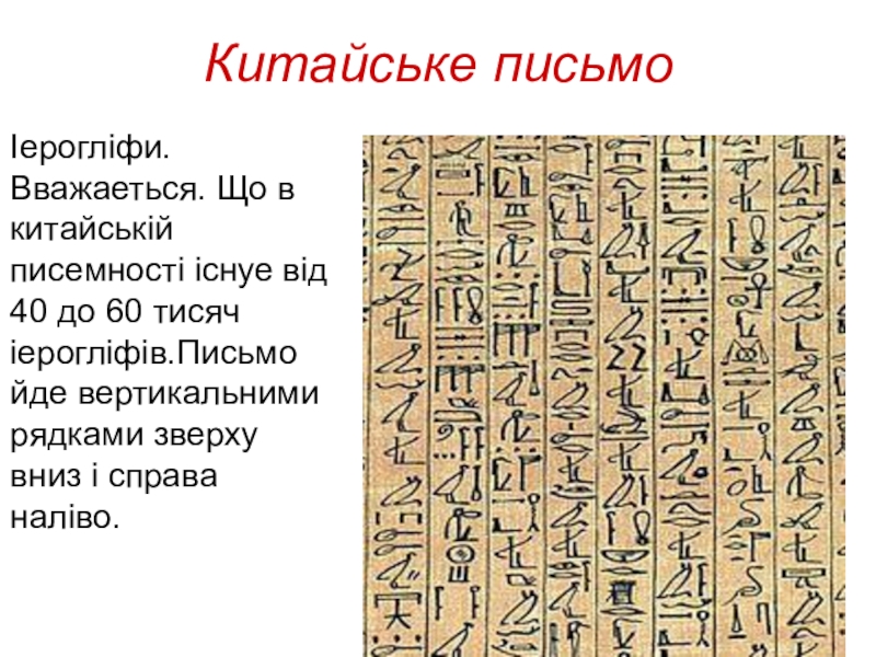 Китайське письмоIероглiфи.Вважаеться. Що в китайськiй писемностi icнуе вiд 40 до 60 тисяч iероглiфiв.Письмо йде вертикальними рядками зверху
