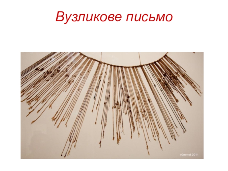 Кiпу(вузликове письмо) – застосовувались мотузки рiзного кольору та розмiру з вузликами. Значення мало все : кiлькiсть вузликiв,iх розмiр,конфiгурацiя, мiсце на мотузцi. Близьке до нього письмо «вампум».