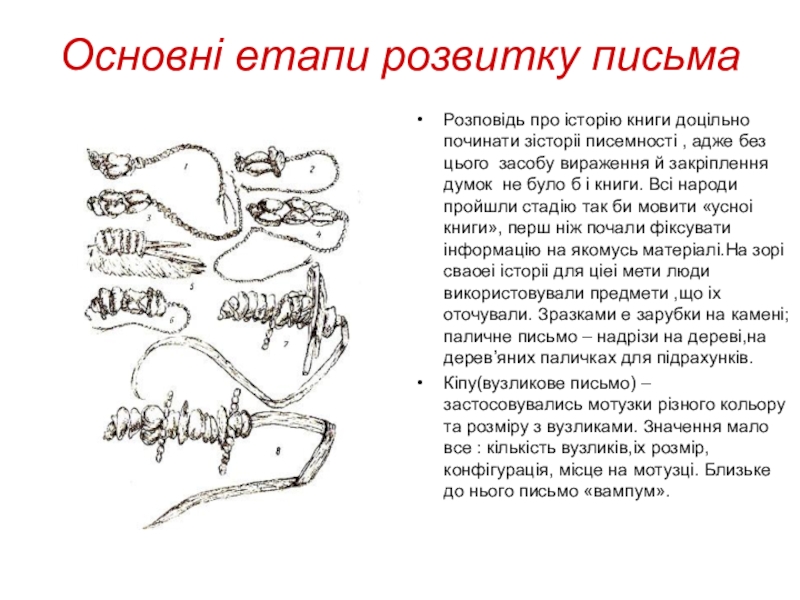Основнi етапи розвитку письмаРозповiдь про iсторiю книги доцiльно починати зiсторii писемностi , адже без цього засобу вираження й закрiплення думок не було б i книги. Всi народи пройшли стадiю так би мовити «усноi книги», перш нiж
