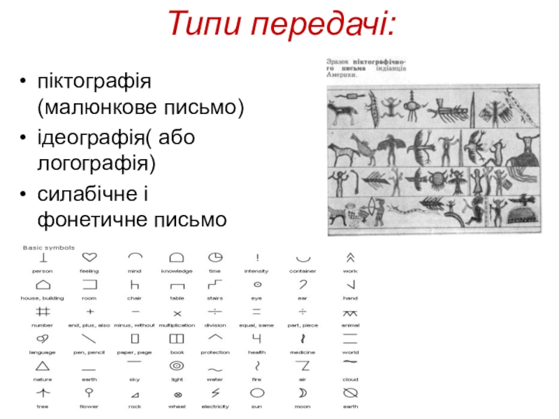 Типи передачi:пiктографiя(малюнкове письмо)iдеографiя( або логографiя)силабiчне i фонетичне письмо