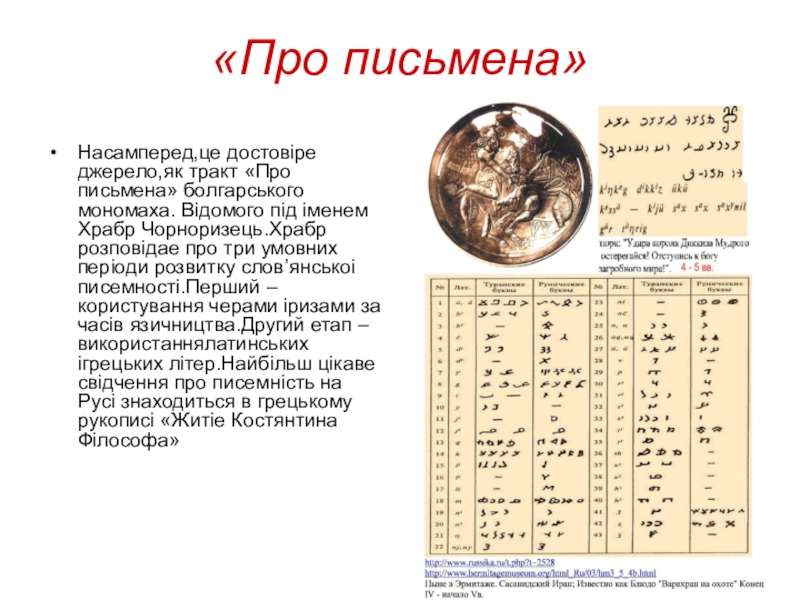 «Про письмена»Насамперед,це достовiре джерело,як тракт «Про письмена» болгарського мономаха. Вiдомого пiд iменем Храбр Чорноризець.Храбр розповiдае про три