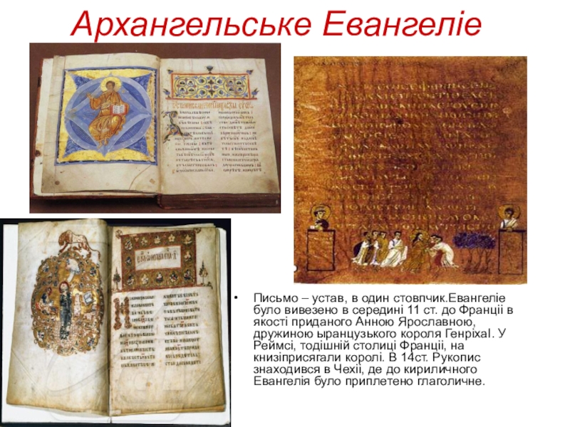 Архангельське ЕвангелiеПисьмо – устав, в один стовпчик.Евангелiе було вивезено в серединi 11 ст. до Францii в якостi