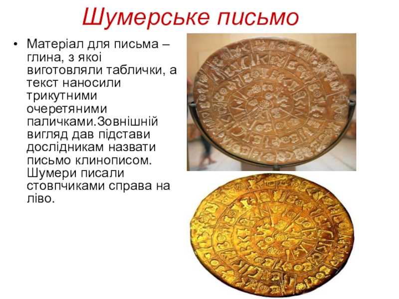 Шумерське письмоМатерiал для письма – глина, з якоi виготовляли таблички, а текст наносили трикутними очеретяними паличками.Зовнiшнiй вигляд