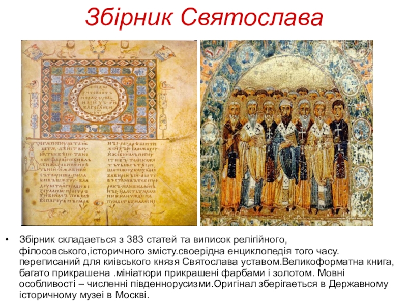 Збiрник СвятославаЗбiрник складаеться з 383 статей та виписок релiгiйного,фiлосовського,iсторичного змiсту.своерiдна енциклопедiя того часу.переписаний для киiвського князя Святослава