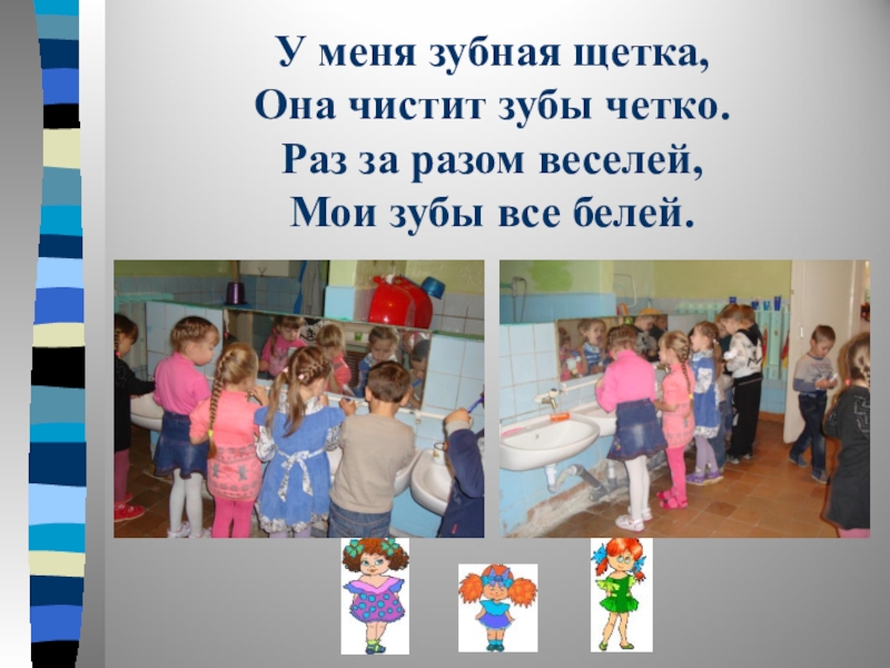 Слайд 9У меня зубная щетка, Она чистит зубы четко. Раз за разом веселей, Мои зубы