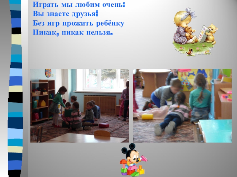 Играть мы любим очень: Вы знаете друзья! Без игр прожить ребёнку Никак, никак нельзя.