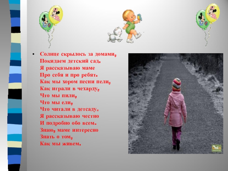 Солнце скрылось за домами,  Покидаем детский сад.  Я рассказываю маме  Про себя и про