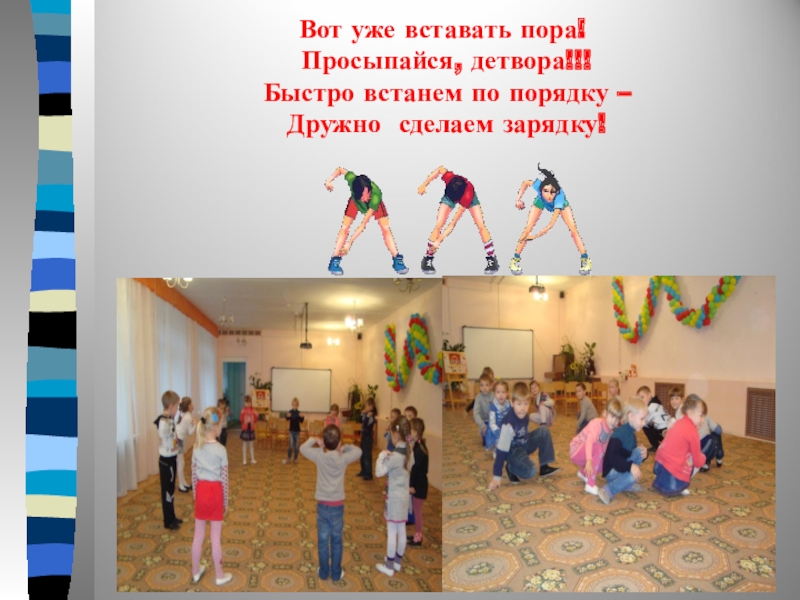 Слайд 5Вот уже вставать пора! Просыпайся, детвора!!! Быстро встанем по порядку –