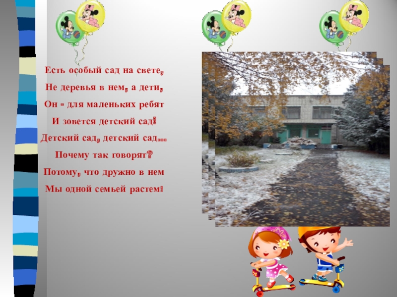 Есть особый сад на свете,Не деревья в нем, а дети,Он - для маленьких ребят И зовется детский сад!Детский сад, детский сад…Почему так говорят?Потому, что дружно в немМы одной семьей растем!