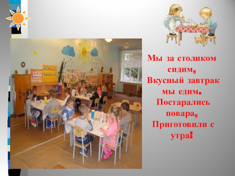 Мы за столиком сидим,  Вкусный завтрак мы едим.  Постарались повара,  Приготовили с