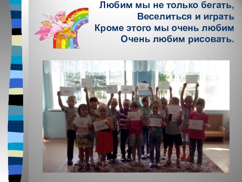 Любим мы не только бегать, Веселиться и играть Кроме этого мы очень любим Очень любим рисовать.