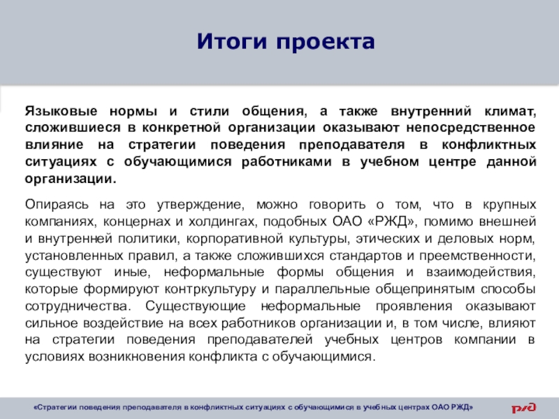 Языковые нормы и стили общения, а также внутренний климат, сложившиеся в конкретной организации оказывают непосредственное влияние на стратегии поведения преподавателя в конфликтных ситуациях с обучающимися работниками в учебном центре данной организации.