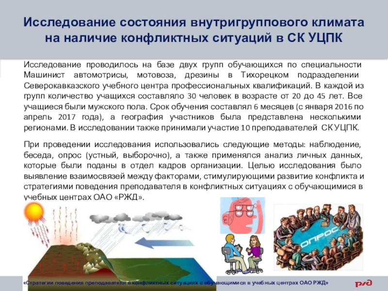 При проведении исследования использовались следующие методы: наблюдение, беседа, опрос (устный, выборочно), а также применялся анализ личных данных, которые были поданы в отдел кадров организации. Целью исследования было выявление взаимосвязей между факторами, стимулирующими развитие конфликта и стратегиями поведения преподавателя в конфликтных ситуациях с обучающимися в учебных центрах ОАО «РЖД».