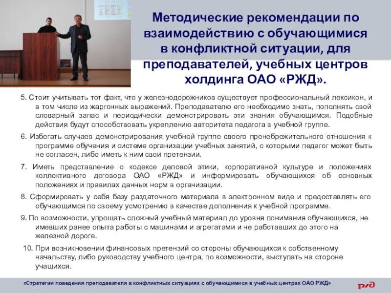 5. Стоит учитывать тот факт, что у железнодорожников существует профессиональный лексикон, и в том числе из жаргонных выражений. Преподавателю его необходимо знать, пополнять свой словарный запас и периодически демонстрировать эти знания обучающимся. Подобные действия будут способствовать укреплению авторитета педагога в учебной группе.