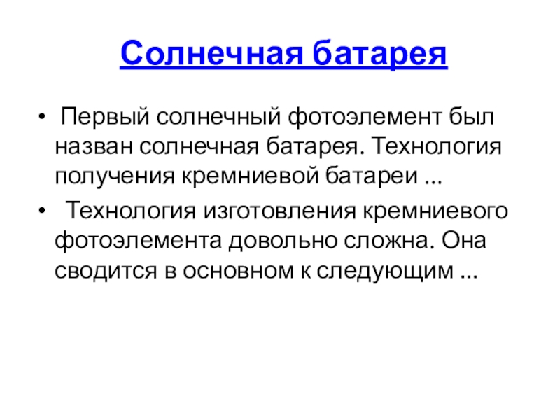 Солнечная батарея Первый солнечный фотоэлемент был назван солнечная батарея. Технология получения кремниевой батареи ...  Технология изготовления кремниевого фотоэлемента