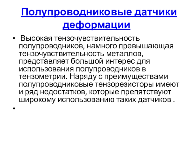 Полупроводниковые датчики деформации Высокая тензочувствительность полупроводников, намного превышающая тензочувствительность металлов, представляет большой интерес для использования полупроводников в тензометрии.