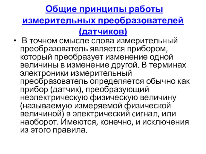Общие принципы работы измерительных преобразователей (датчиков) В точном смысле слова измерительный преобразователь является прибором, который преобразует изменение одной