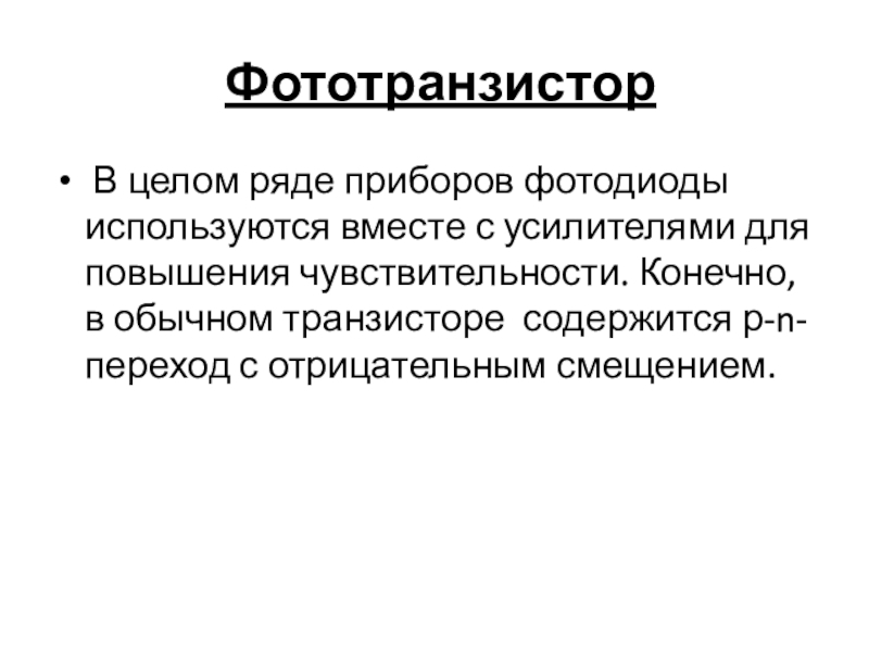 Фототранзистор В целом ряде приборов фотодиоды используются вместе с усилителями для повышения чувствительности. Конечно, в обычном транзисторе  содержится