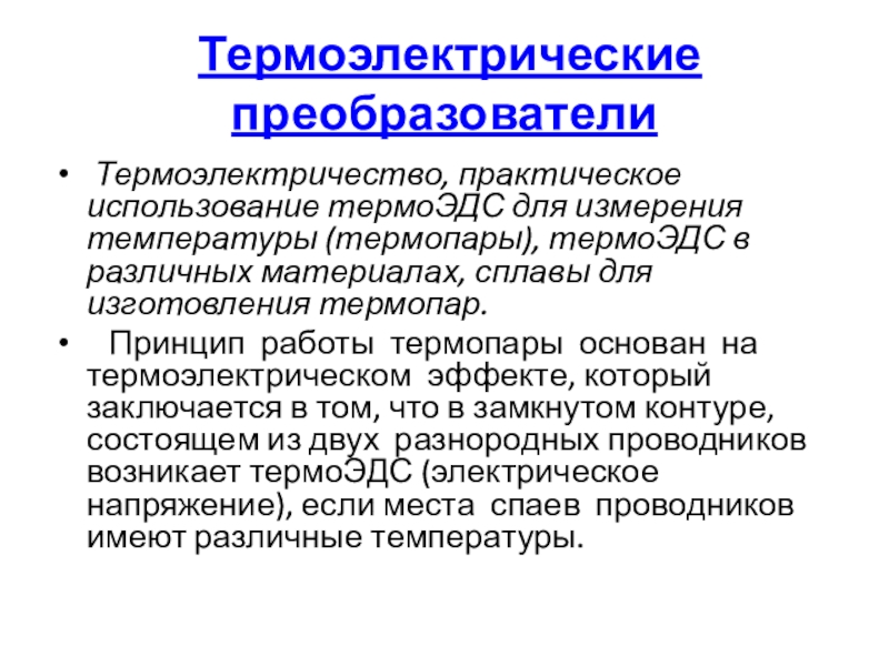 Термоэлектрические преобразователи  Термоэлектричество, практическое использование термоЭДС для измерения температуры (термопары), термоЭДС в различных материалах, сплавы для изготовления термопар.