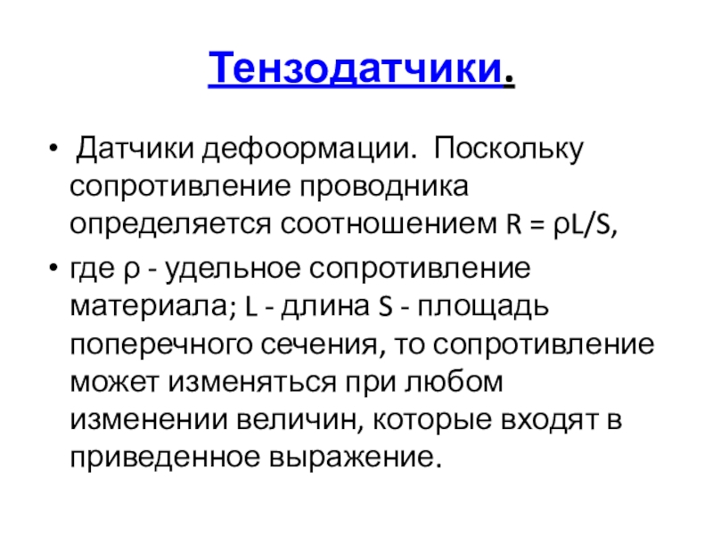 Тензодатчики. Датчики дефоормации.  Поскольку сопротивление проводника определяется соотношением R = ρL/S,где ρ - удельное сопротивление материала; L - длина S -