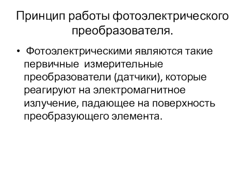 Принцип работы фотоэлектрического преобразователя. Фотоэлектрическими являются такие первичные  измерительные преобразователи (датчики), которые реагируют на электромагнитное излучение, падающее на