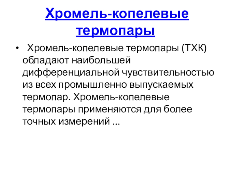 Хромель-копелевые термопары  Хромель-копелевые термопары (ТХК) обладают наибольшей дифференциальной чувствительностью из всех промышленно выпускаемых термопар. Хромель-копелевые термопары применяются