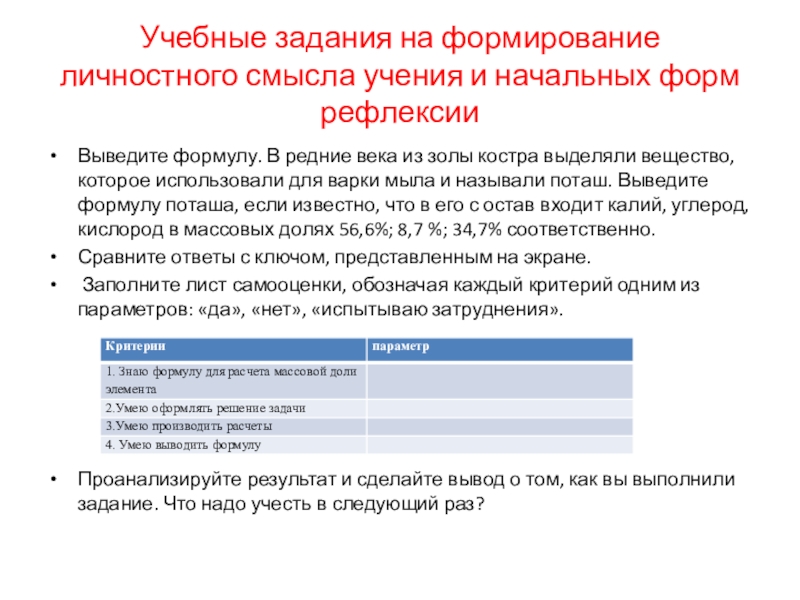 Слайд 7Учебные задания на формирование личностного смысла учения и начальных форм рефлексии