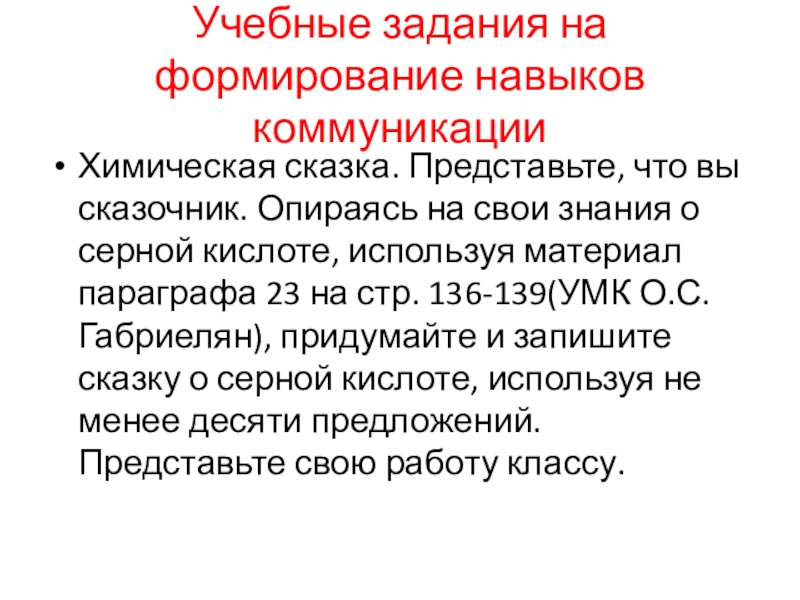 Опираясь на свои знания о серной кислоте, используя материал параграфа 23 на стр. 136-139(УМК О.С. Габриелян), придумайте и запишите сказку о серной кислоте, используя не менее десяти предложений. Представьте свою работу классу.