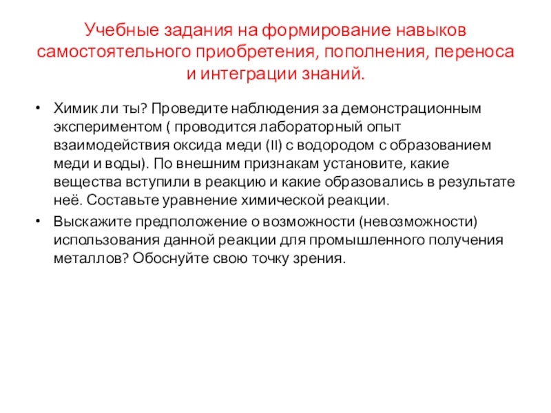 Слайд 9Учебные задания на формирование навыков самостоятельного приобретения, пополнения, переноса и интеграции