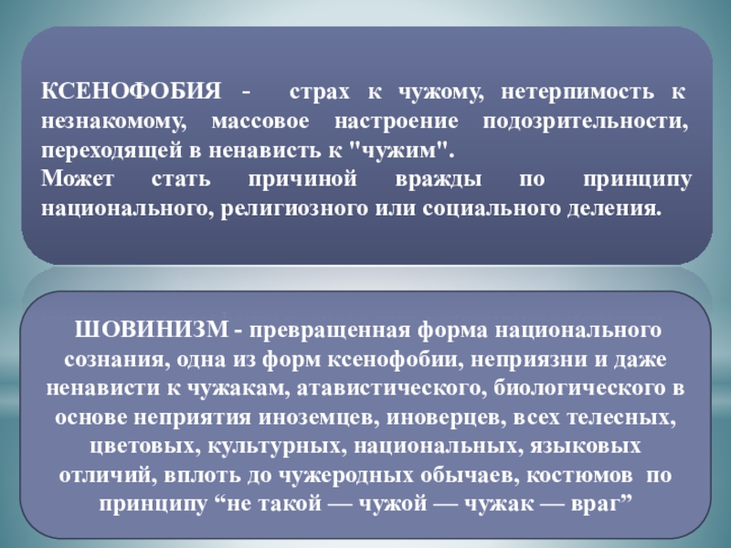КСЕНОФОБИЯ - страх к чужому, нетерпимость к незнакомому, массовое настроение подозрительности, переходящей в ненависть к "чужим".