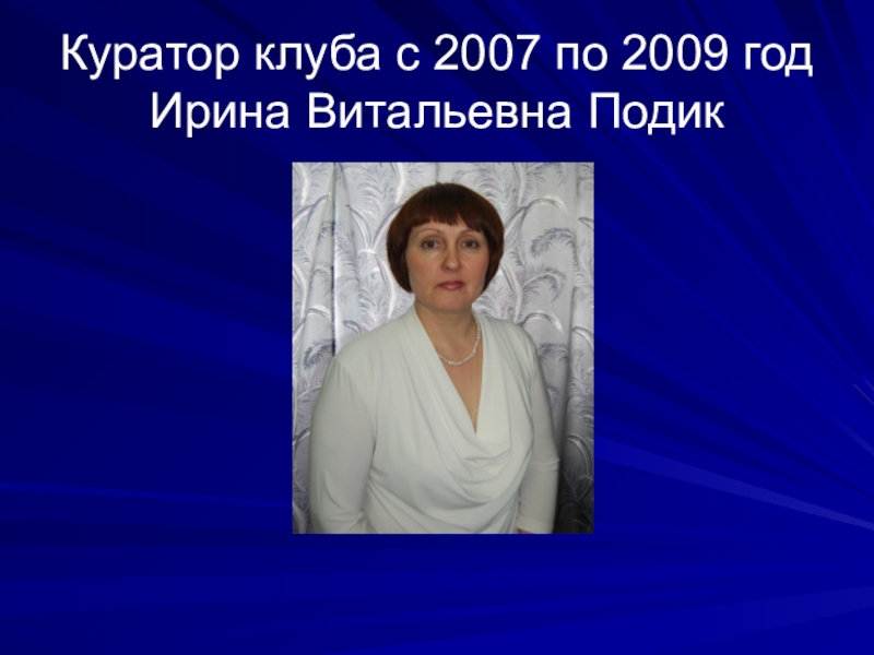 Слайд 5Куратор клуба с 2007 по 2009 год Ирина Витальевна Подик