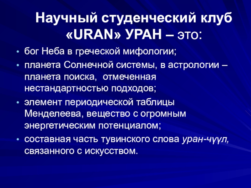 Слайд 3Научный студенческий клуб «URAN» УРАН – это: