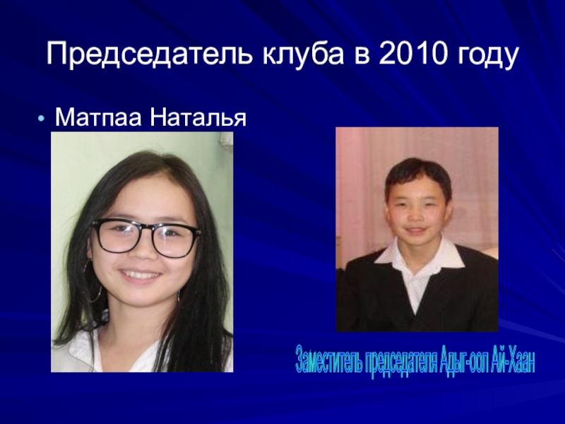 Председатель клуба в 2010 годуЗаместитель председателя Адыг-оол Ай-Хаан Матпаа Наталья