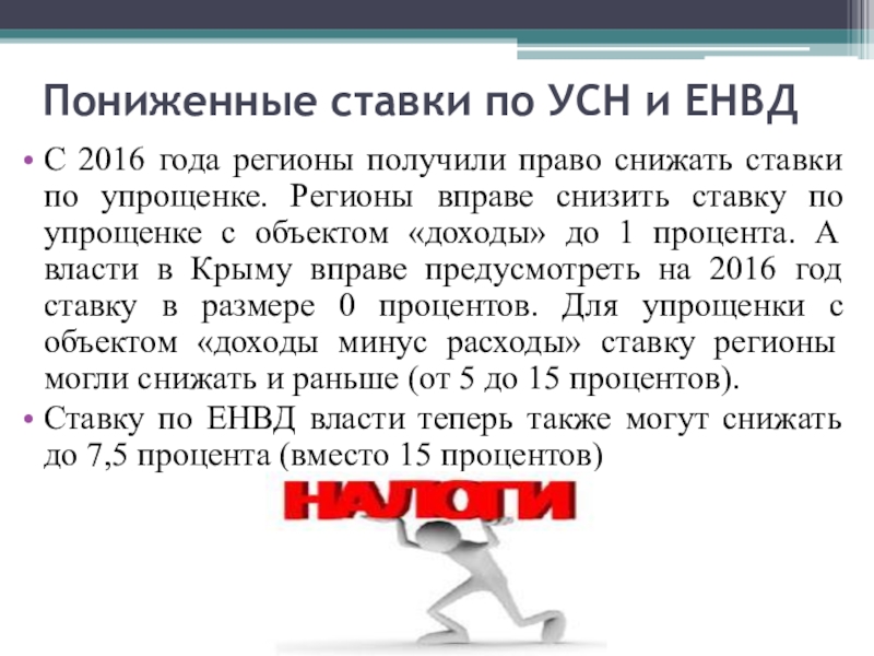 Слайд 10Пониженные ставки по УСН и ЕНВД