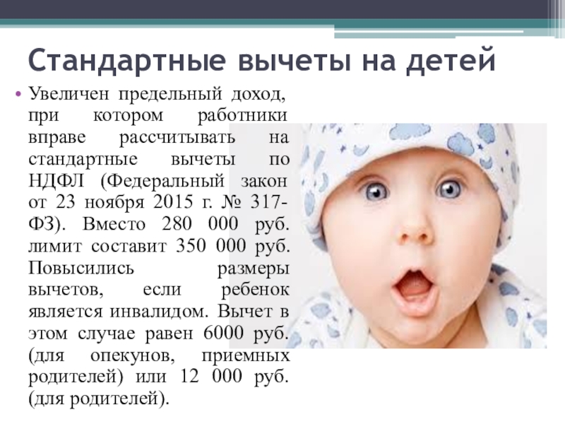 на стандартные вычеты по НДФЛ (Федеральный закон от 23 ноября 2015 г. № 317-ФЗ). Вместо 280 000 руб. лимит составит 350 000 руб. Повысились размеры вычетов, если ребенок является инвалидом. Вычет в этом случае равен 6000 руб. (для опекунов, приемных родителей) или 12 000 руб. (для родителей).