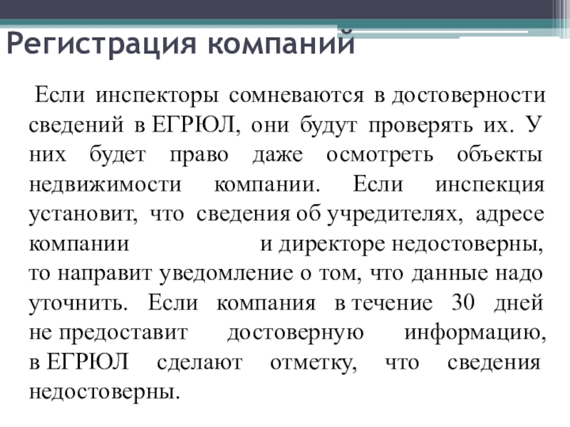 У них будет право даже осмотреть объекты недвижимости компании. Если инспекция установит, что сведения об учредителях, адресе компании и директоре недостоверны, то направит уведомление о том, что данные надо уточнить. Если компания в течение 30 дней не предоставит достоверную информацию, в ЕГРЮЛ сделают отметку, что сведения недостоверны.