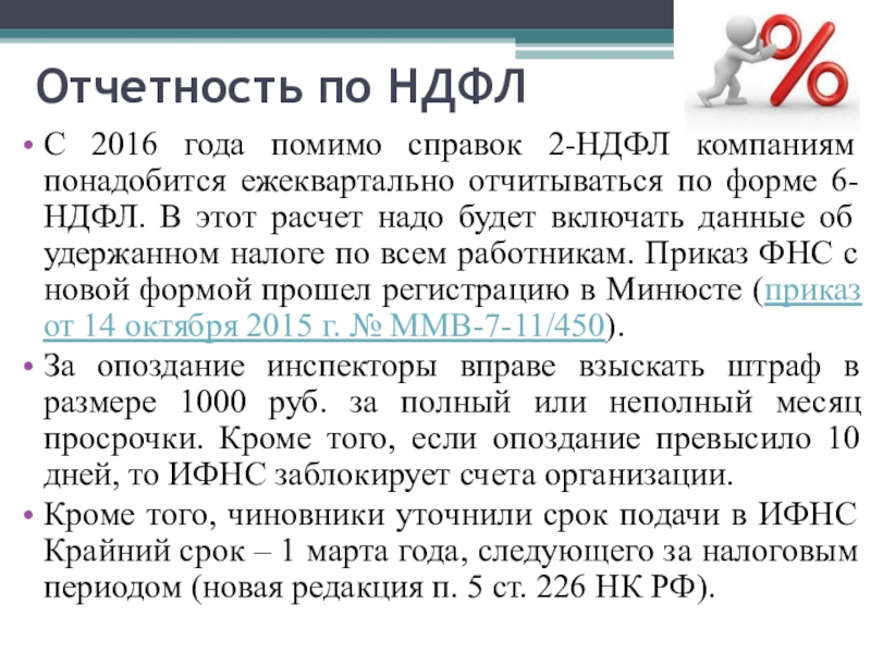 отчитываться по форме 6-НДФЛ. В этот расчет надо будет включать данные об удержанном налоге по всем работникам. Приказ ФНС с новой формой прошел регистрацию в Минюсте (приказ от 14 октября 2015 г. № ММВ-7-11/450).